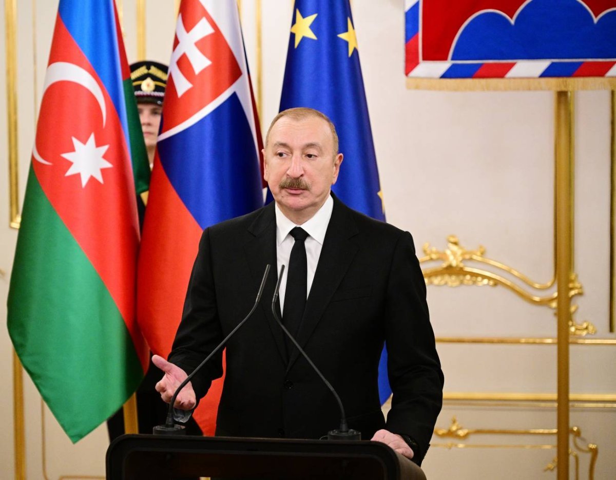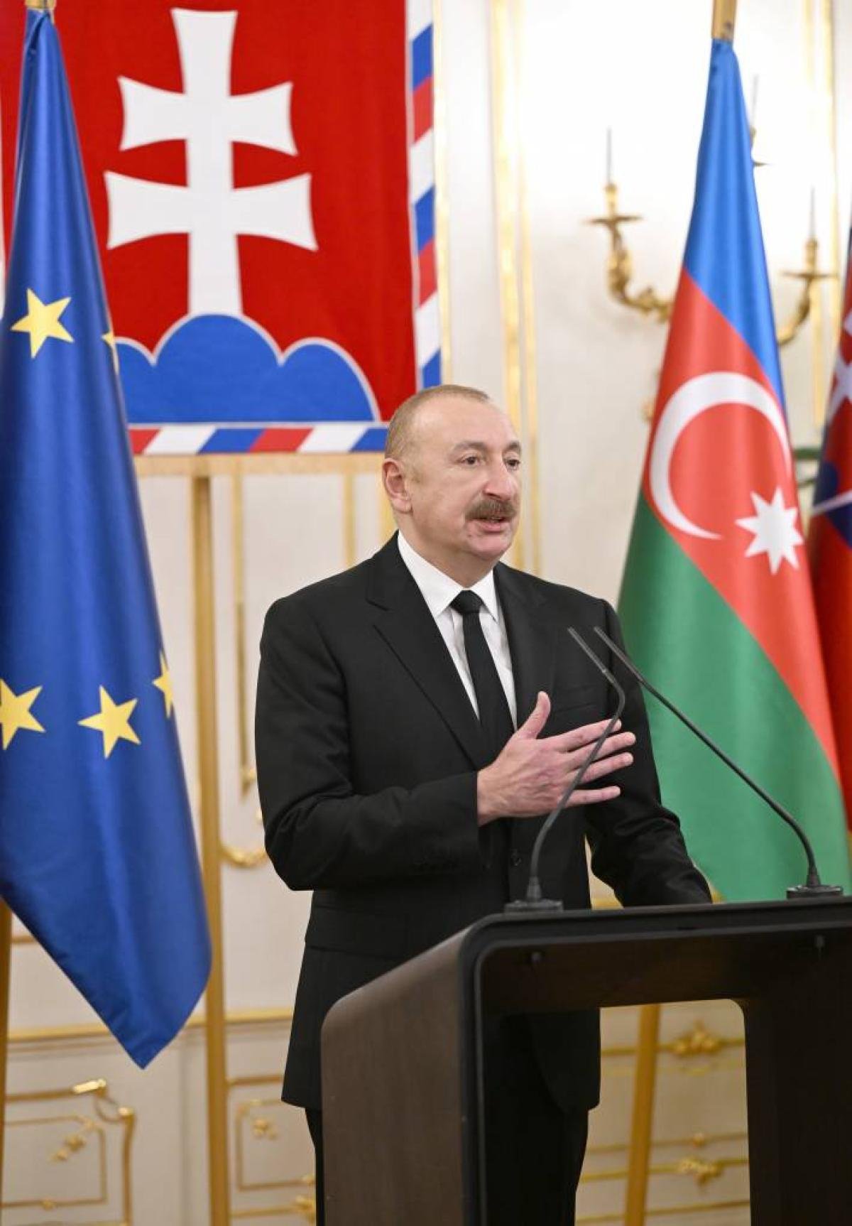Cənab Prezident, mən şadam ki, Siz mənim dəvətimi qəbul etmisiniz. Bu, Azərbaycan Prezidentinin Slovakiyaya tarixdə ilk rəsmi səfəridir. Bu, bizim qarşılıqlı marağımızı ən yüksək səviyyədə təsdiq edir. Biz strateji tərəfdaşlıq qurmaq və onu inkişaf etdirmək niyyətindəyik. Biz cənab Prezidentlə geniş tərkibdə və təkbətək formatda geniş müzakirələr apardıq. Biz keçmişdə dəfələrlə görüşmüşük. Hər zaman olduğu kimi, görüşümüz səmimi və açıq şəkildə həyata keçirilmişdir. Çünki bizim ölkələrimiz dost ölkələrdir və bizim münasibətlərimiz hər zaman yaxşı səviyyədə olub.