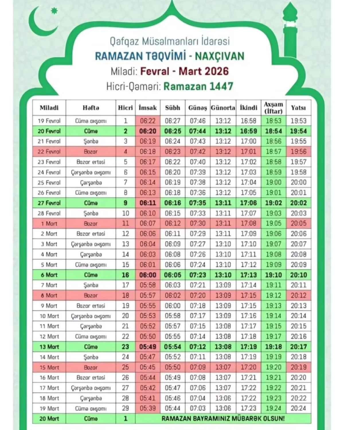 "NAXÇIVANXƏBƏRLƏRİ"-nin məlumatına görə, Qafqaz Müsəlmanları İdarəsinin Qazılar Şurasının Ramazan ayının başlanması münasibətilə yaydığı fətvada bu il Ramazan ayının 1-i miladi təqvimlə fevralın 19-na təsadüf etdiyi qeyd olunub.