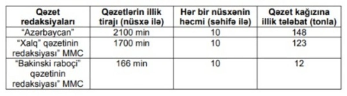 Qərara əsasən, dövlət sifarişlərinin yerinə yetirilməsi üçün "Azərbaycan" qəzeti redaksiyasına, "Xalq" qəzetinin redaksiyası" Məhdud Məsuliyyətli Cəmiyyətinə və "Bakinski raboçi" qəzetinin redaksiyası" Məhdud Məsuliyyətli Cəmiyyətinə dövlət büdcəsinin vəsaiti hesabına alınacaq qəzet kağızının norması aşağıdakı kimidir: