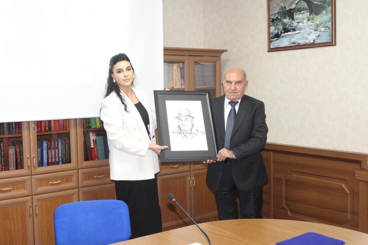 Təsviri və dekorativ tətbiqi sənətlər şöbəsinin müdiri Şəmsiyyə Zalova yubilyarı təbrik edərək hazırladığı Əli Kətən oğlu Qəhrəmanovun qrafik portretini ona təqdim edib.