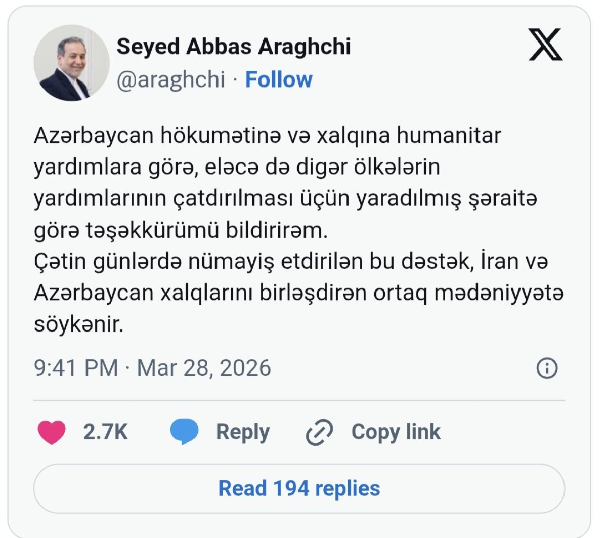 İranın xarici işlər naziri Abbas Əraqçi humanitar yardımlara görə Azərbaycana təşəkkür edib.