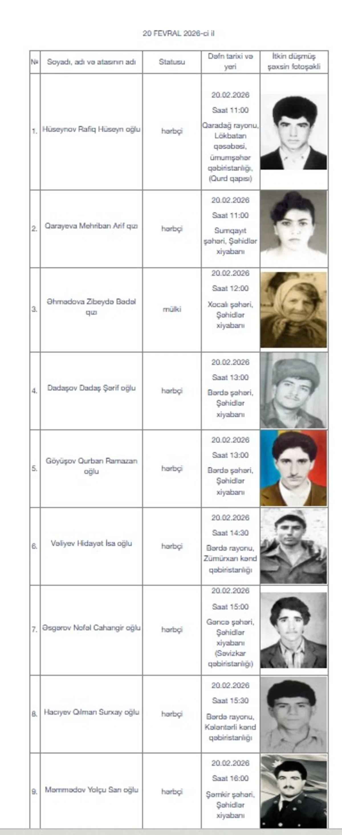 İtkin-şəhidlərin bir qismi fevralın 19-da, digər qismi isə fevralın 20-də dəfn olunacaq.
