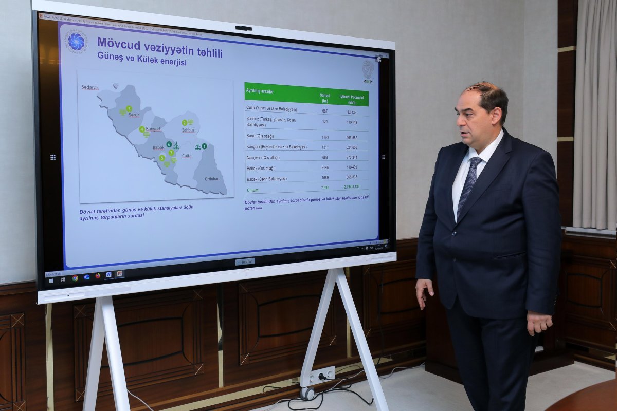 Görüşdə Naxçıvan Muxtar Respublikasında “Yaşıl enerji zonası” konsepsiyası təqdim olunub. Konsepsiya əsasında Naxçıvanın “yaşıl enerji” zonasına çevrilməsi, muxtar respublikada yeni elektrik stansiyalarının inşası və enerji ixracı layihələrinin icrası ilə bağlı görüləcək işlər diqqətə çatdırılıb. Qeyd edilib ki, konsepsiya bərpa olunan enerjinin istifadəsinin genişləndirilməsi, enerji müstəqilliyinin və dayanıqlı inkişafın təmin olunması, müasir şəbəkə infrastrukturunun qurulması, enerji ixracı imkanlarının genişləndirilməsi, karbon emissiyasının əhəmiyyətli dərəcədə azaldılması, innovativ texnologiyaların tətbiqi, sosial-iqtisadi inkişafın sürətləndirilməsi və yeni iş yerlərinin yaradılması kimi hədəfləri özündə ehtiva edir. Ötən dövrdə aparılan mövcud vəziyyətin təhlili onu deməyə əsas verir ki, Naxçıvan bu layihələrin icrasını şərtləndirən zəngin Günəş, külək, hidro və bioenerji resurslarına malikdir.