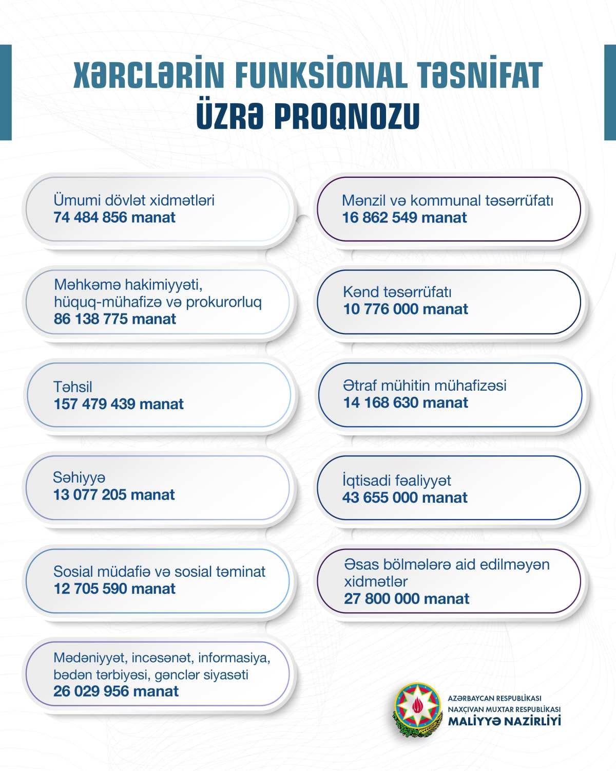2026-cı ildə xərclərin funksional təsnifat üzrə bölgüsü də müəyyənləşdirilib. Ən böyük vəsait təhsil sahəsinə yönəldilərək 157 milyon 479 min 439 manat təşkil edib. Məhkəmə hakimiyyəti, hüquq-mühafizə və prokurorluq orqanları üçün 86 milyon 138 min 775 manat, ümumi dövlət xidmətlərinə isə 74 milyon 484 min 856 manat vəsait ayrılıb.