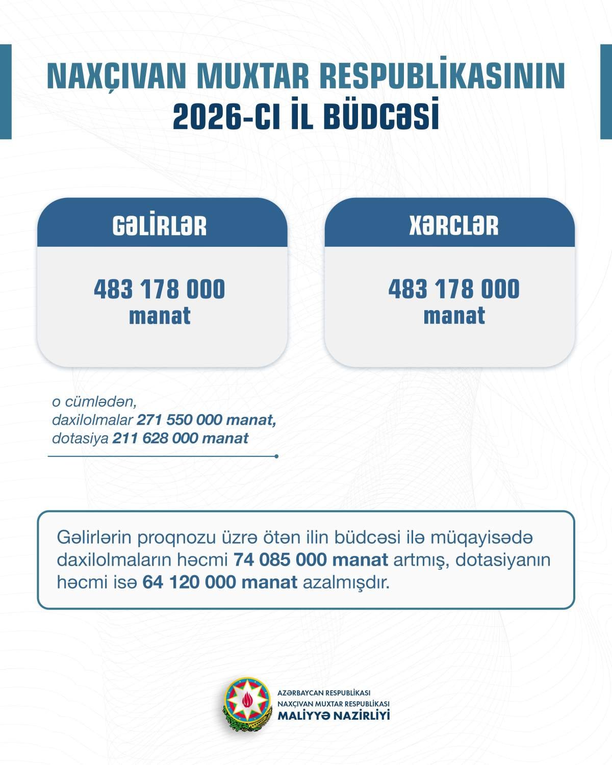 "NAXÇIVANXƏBƏRLƏRİ" məlumat verir ki, Naxçıvan Muxtar Respublikası Maliyyə Nazirliyinin sosial şəbəkə hesablarında yaydığı məlumata görə, növbəti il üçün büdcənin gəlirləri və xərcləri 483 milyon 178 min manat həcmində proqnozlaşdırılıb.