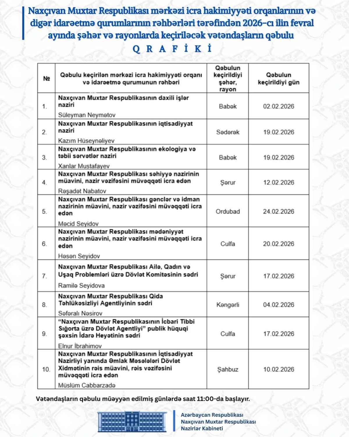 Naxçıvan Muxtar Respublikasında dövlət qurumlarının rəhbərləri 2026-cı ilin fevral ayında vətəndaş qəbulları keçirəcək.