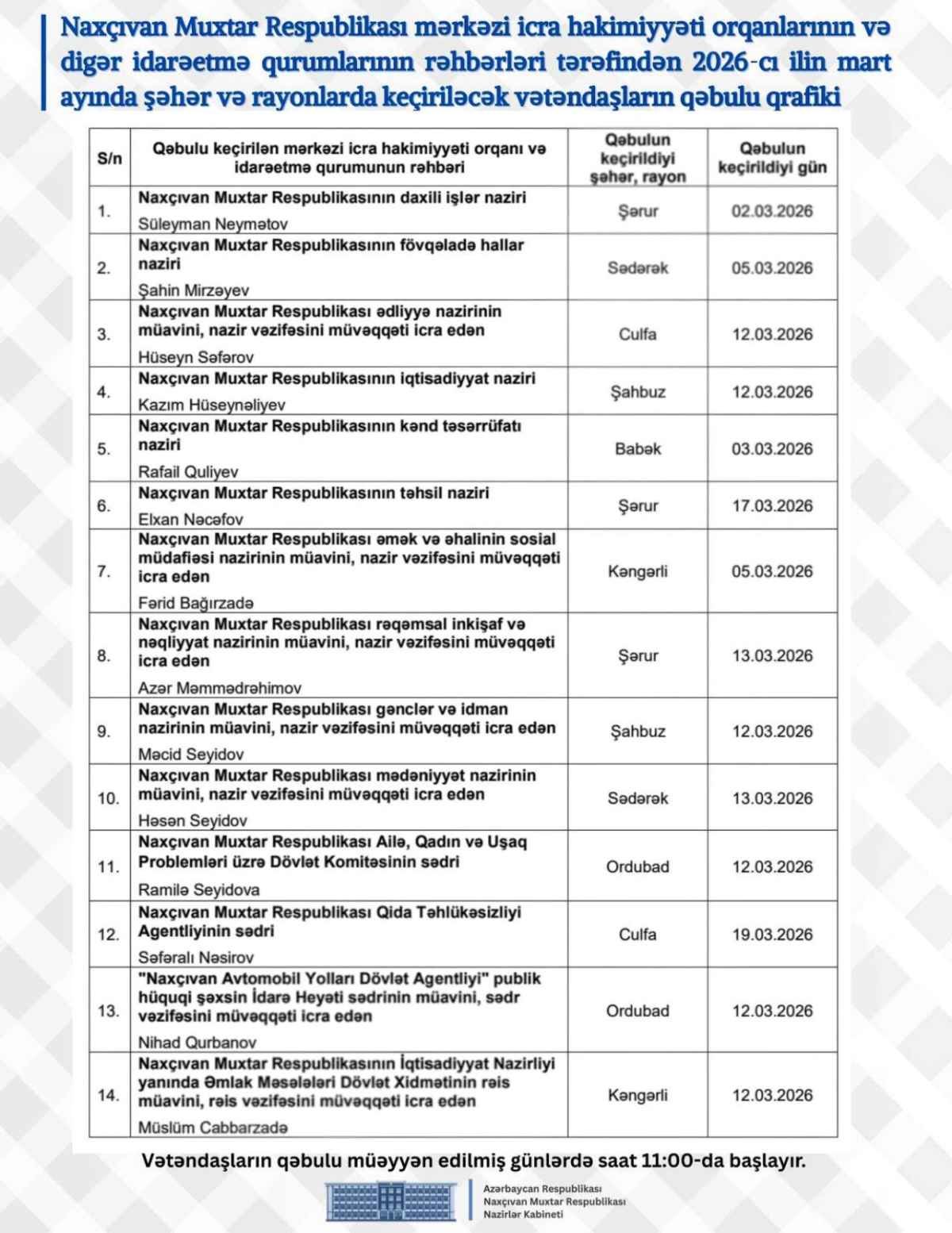 Naxçıvan Muxtar Respublikasında dövlət qurumlarının rəhbərləri 2026-cı ilin mart ayında vətəndaş qəbulları keçirəcək.