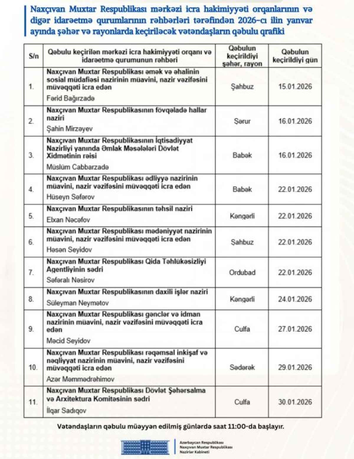 Naxçıvan Muxtar Respublikasında dövlət qurumlarının rəhbərləri 2026-cı ilin yanvar ayında vətəndaş qəbulları keçirəcəkə