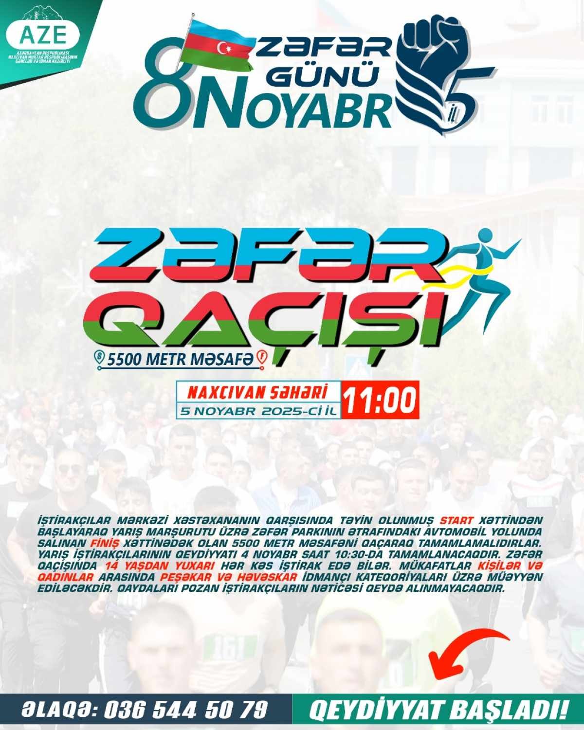 8 Noyabr – Zəfər Günü münasibətilə Naxçıvan şəhərində “Zəfər qaçışı” adlı kütləvi idman tədbiri keçirilək. Yarış Naxçıvan Muxtar Respublikası Gənclər və İdman Nazirliyinin təşkilatçılığı ilə reallaşacaq yarışda 14 yaşdan yuxarı istənilən şəxs iştirak edə bilər. Mükafatçılar kişilər və qadınlar arasında peşəkar və həvəskar idmançı kateqoriyalarında qiymətləndiriləcəklər. Bundan əlavə nominasiya qalibləri də təltif olunacaqdır.