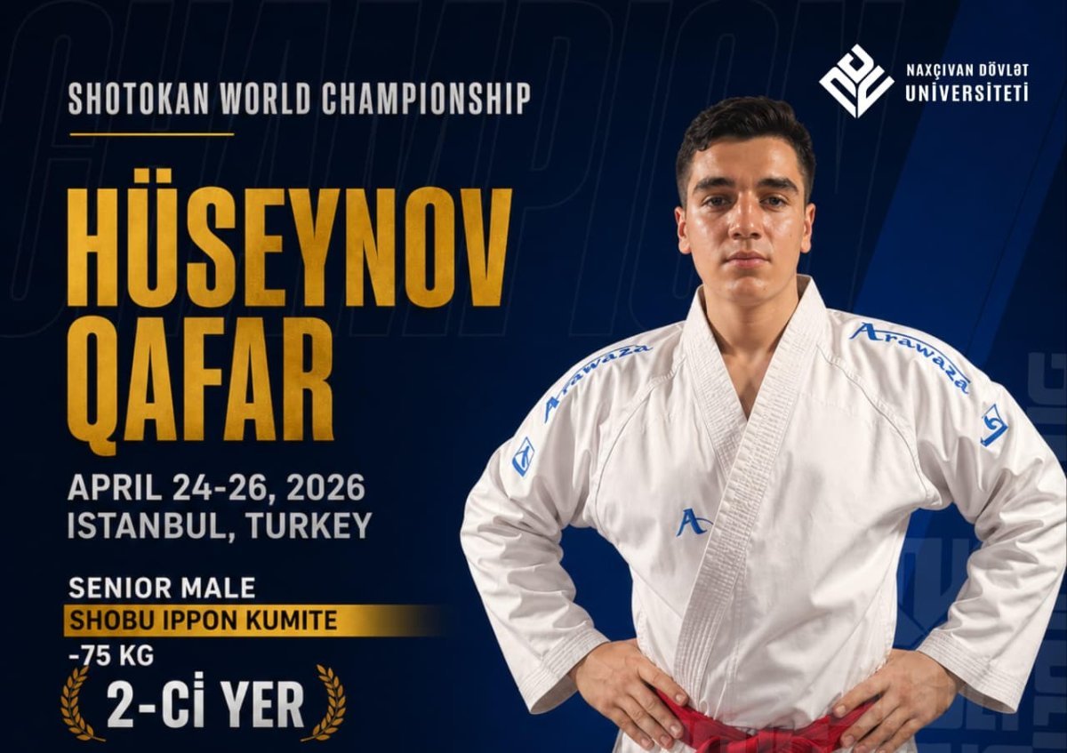 "NAXÇIVANXƏBƏRLƏRİ" məlumat verir ki, 24–26 aprel tarixlərində İstanbul şəhərində keçirilən “16th Shotokan World Championship” yarışında iştirak edən idmançımız yüksək nəticə göstərib. Qafar Hüseynov Senior Male “Shobu Ippon Kumite (75 kq)” və “Senior Male Shobu Nihon Kumite (75 kq)” kateqoriyalarında mübarizə apararaq hər iki növdə II yerə layiq görülüb.