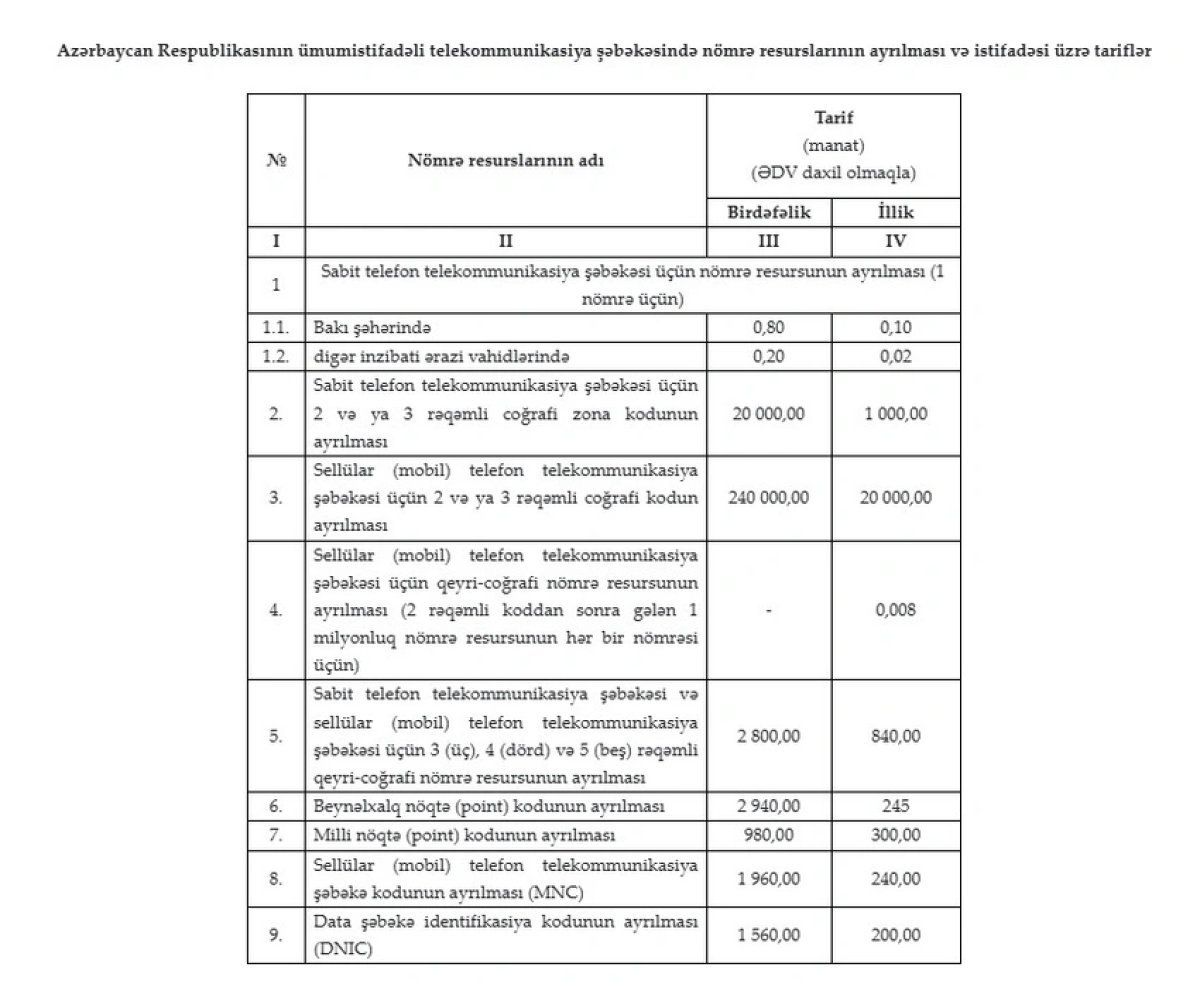 Rəqəmsal İnkişaf və Nəqliyyat Nazirliyinin Kollegiyası "Ümumistifadəli telekommunikasiya şəbəkəsində nömrə resurslarının ayrılması və istifadəsi üzrə tariflər"i təsdiq edib.