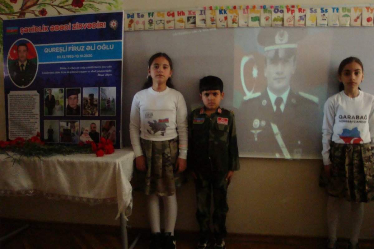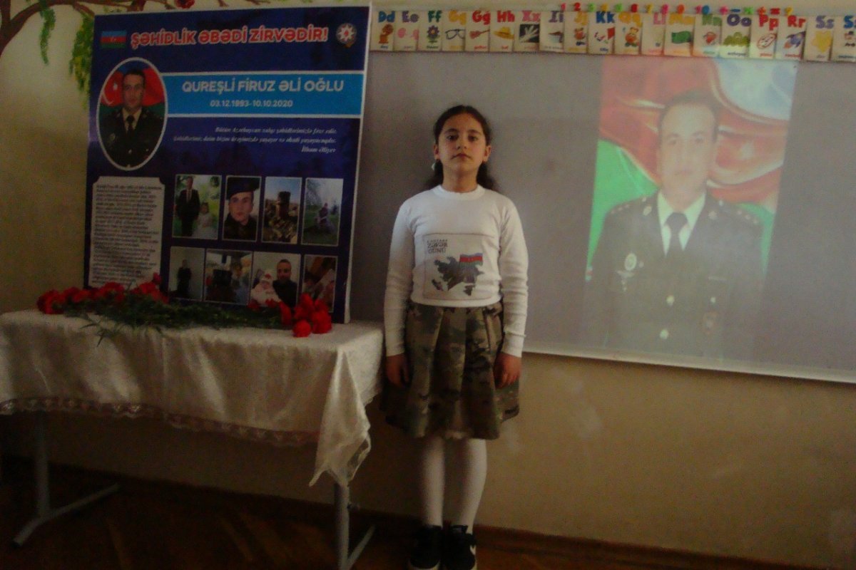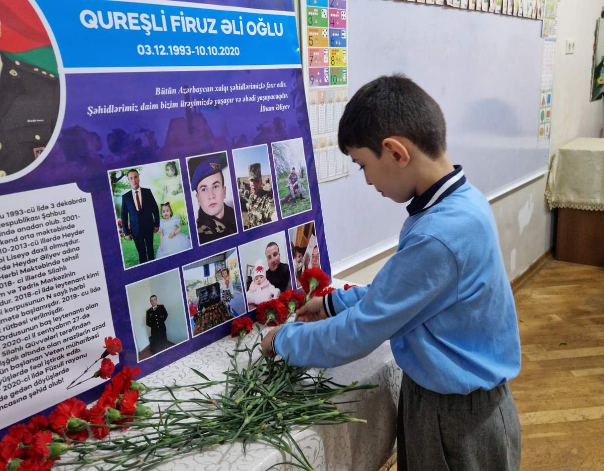 Şagirdlərə qəhrəmanlıq nümunəsi kimi təqdim olunan Firuz Qureşlinin xatirəsinə həsr olunmuş videoçarxlar nümayiş etdirilib.